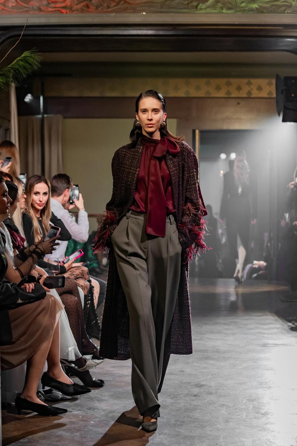 Коллекция охватывает все ключевые элементы гардероба современной женщины: брючные костюмы, деловые платья, трикотаж, брюки, юбки, жилетки и вечерние наряды. Особое место отведено жакетам и корсетным платьям с объемными рукавами.