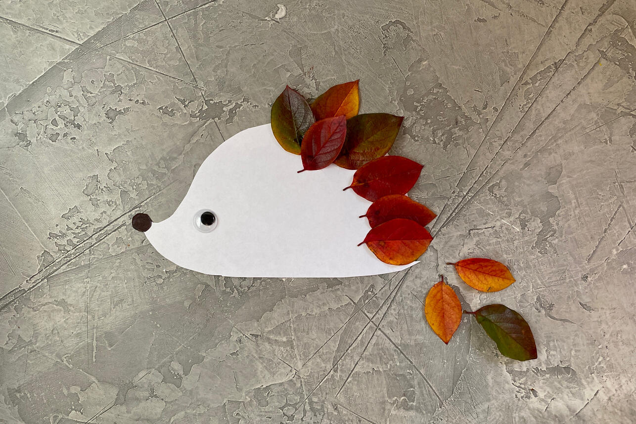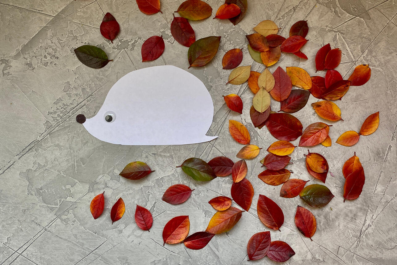 На картоне или листе А4 нарисуйте контур для вашей аппликации, как изображено на рисунке 1. Вырежьте фигуру ежика. Раскрасьте черным фломастером ему носик, приклейте пластиковый глазик или пуговицу.