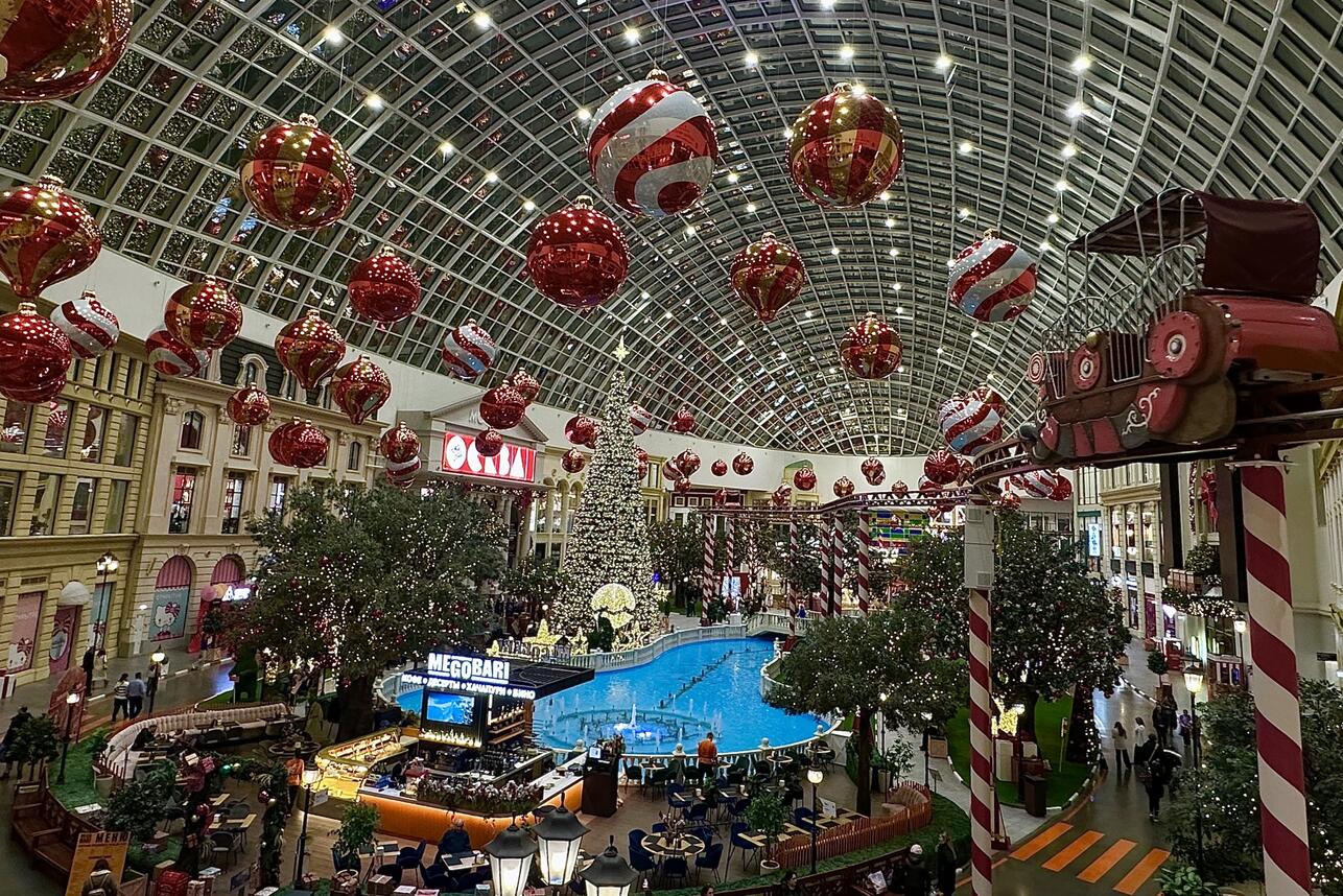 Здесь же посетителей ждут новые зимние фотозоны и арт-объекты: пряничные домики, тоннели из гирлянд, фигуры в виде конфет и леденцов, а под стеклянным куполом парят 76 огромных новогодних шаров.