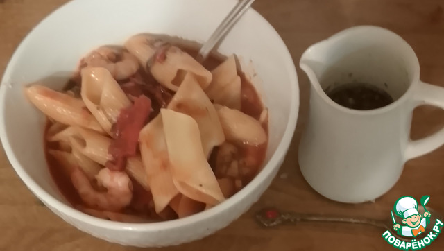 Предлагается ароматное, согревающее блюдо " Паста с креветками, томатами с освежающим соусом из орехов, лимона и кориандра" от знаменитого палестинского повара Сами Тамими. Как известно, его блюда в рекламе не нуждаются. Немаловажно, что готовиться блюдо в одном казане, что даёт вам минимум грязной посуды.