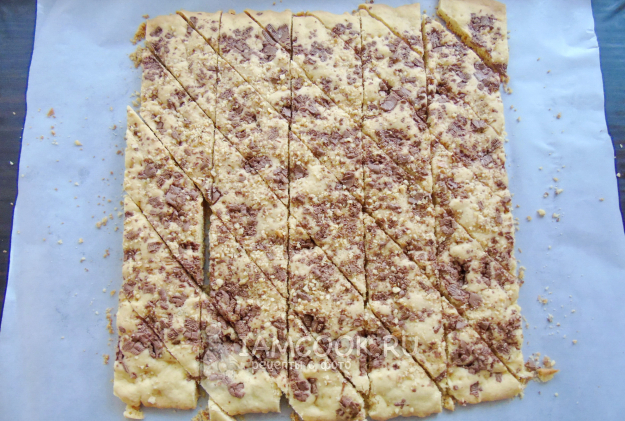 Горячий корж достаньте из духовки и сразу же, еще горячим, нарежьте ромбами или полосками, или квадратами.