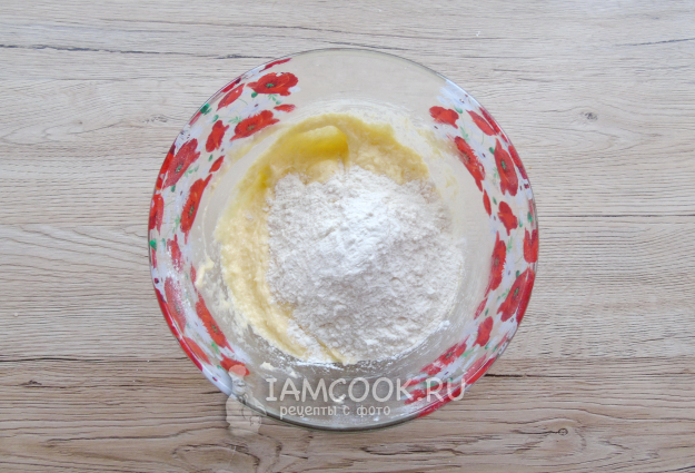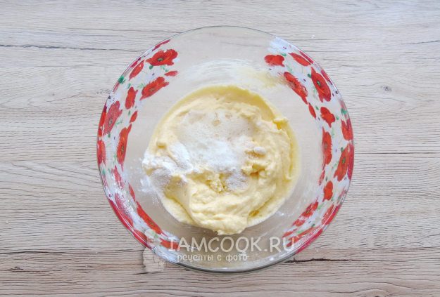 Добавьте соду, погашенную уксусом или лимонным соком. Щепотку соли, разрыхлитель и ваниль или ванильный сахар, перемешайте.