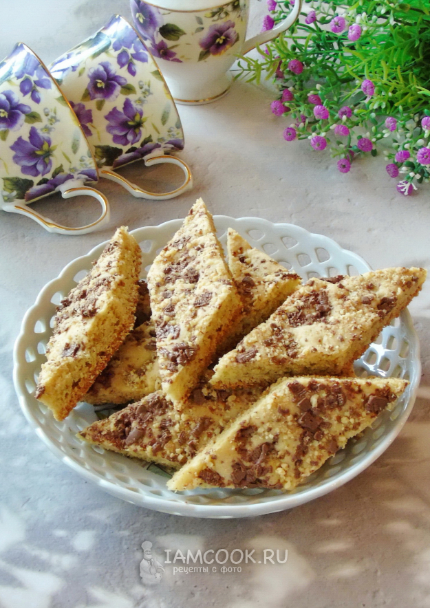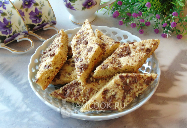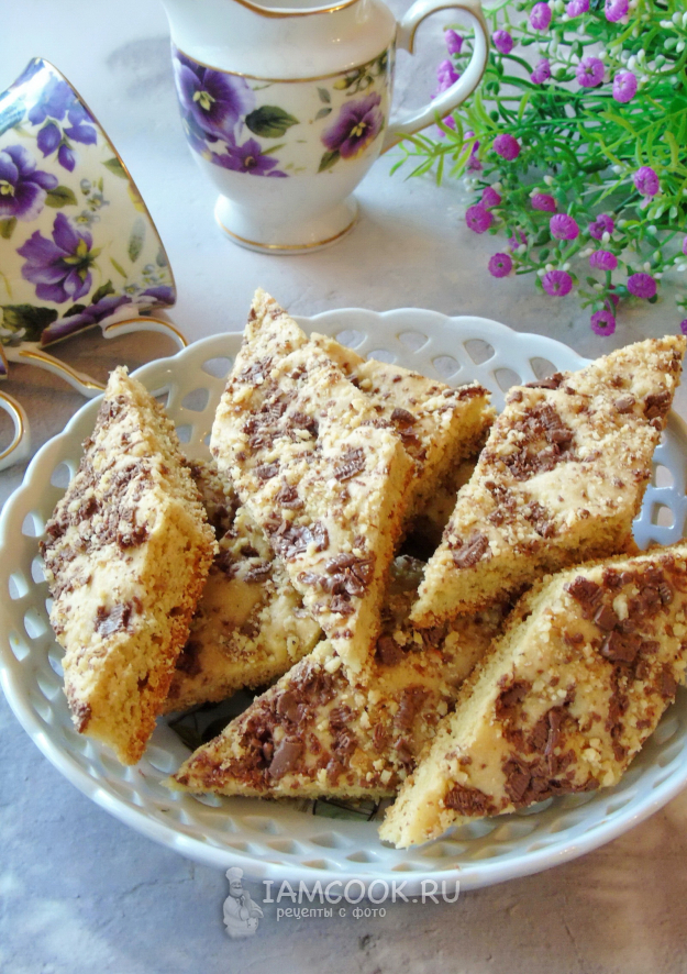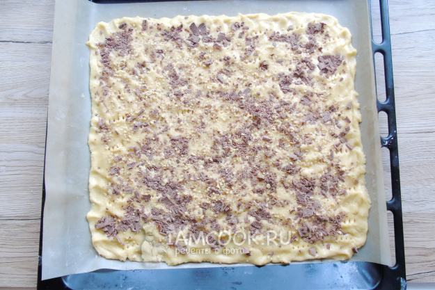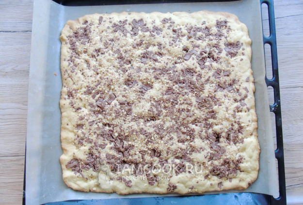 Шоколад измельчите и тоже посыпьте им тесто, немного вдавливая в него.
