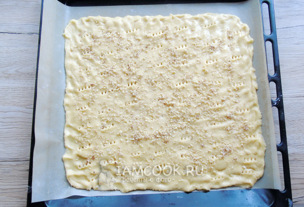 Присыпая понемногу тесто мукой, распределите его рукой на противне с бумагой для выпечки. Наколите тесто вилкой. Грецкие орехи прокалите на сухой сковороде и измельчите любым способом. Посыпьте ими тесто.