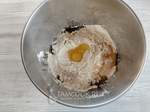 В муку добавить соль, масло и половину яйца. Я делала двойную порцию теста.