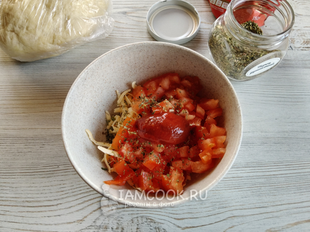 Нарезать в сыр помидор, добавить немного сухих трав (смесь итальянских, прованских или французских) и кетчуп.