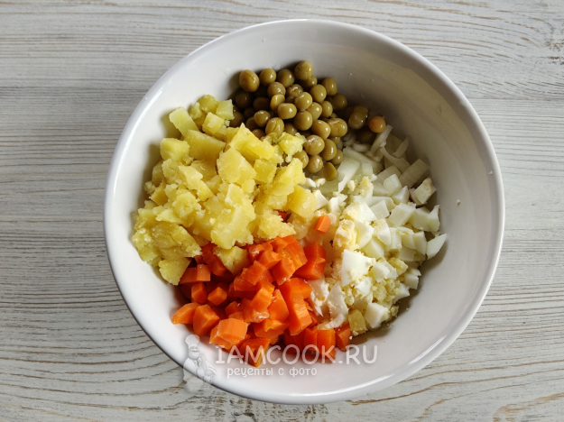Когда все остынет, нарезать кубиком все ингредиенты для салата. Добавить горошек.