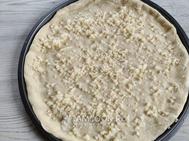 Тесто раскатать на круглый лист для пиццы или противень.
