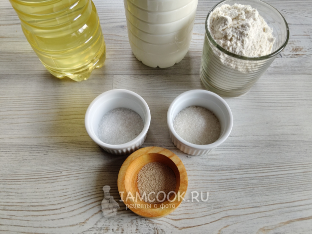 В теплом молоке развести дрожжи и сахар. Спустя 10 минут добавить муку и соль.