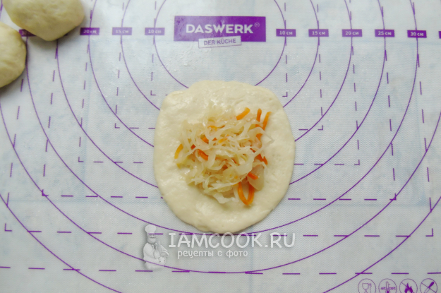 Каждый шарик раскатайте в лепешку, на середину которой выложите начинку.