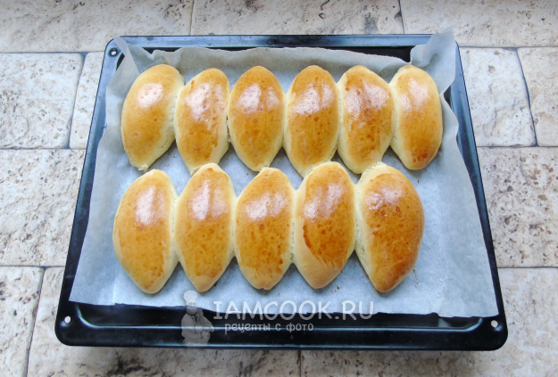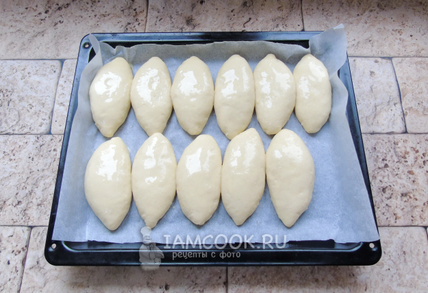 Выложите пирожки швом вниз на противень с пекарской бумагой
