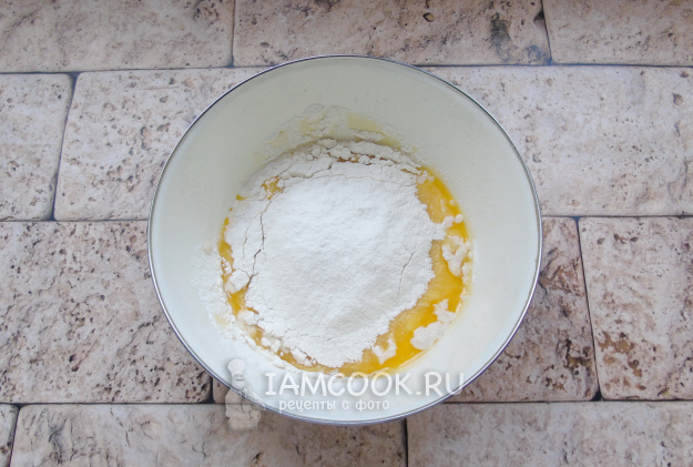 Добавьте соль и постепенно насыпьте просеянную муку.