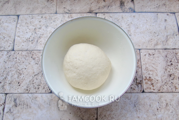 Накройте миску с тестом пищевой пленкой и поставьте в теплое место. Через 50-60 минут тесто подойдет и значительно увеличится в объеме.