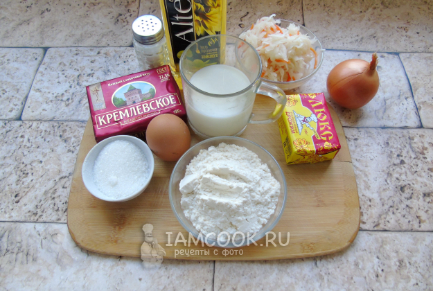 Соберите ингредиенты для приготовления пирожков с квашеной капустой в духовке.