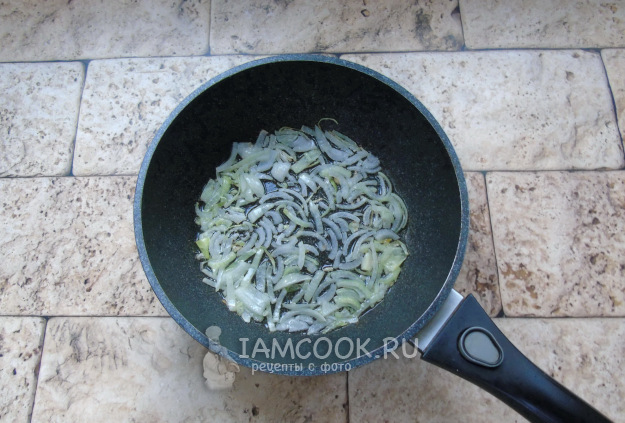 Пока тесто подходит, займитесь начинкой для пирожков. Репчатый лук очистите, помойте и нарежьте. Выложите в сковороду с растительным маслом. Жарьте до прозрачности.