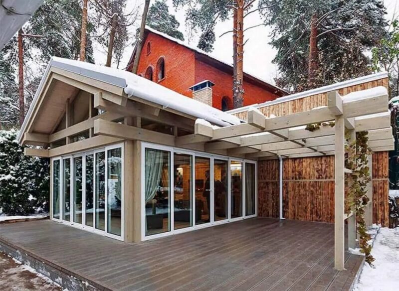 Конструкция выполнена из прочного бруса с использованием технологии вертикальной укладки, что обеспечивает стенам особую надёжность и долговечность. Фундамент монолитный, гарантирующий устойчивость сооружения. Внутри беседки всегда тепло и уютно, что позволяет собираться там в любую погоду, не опасаясь холода или дождя.