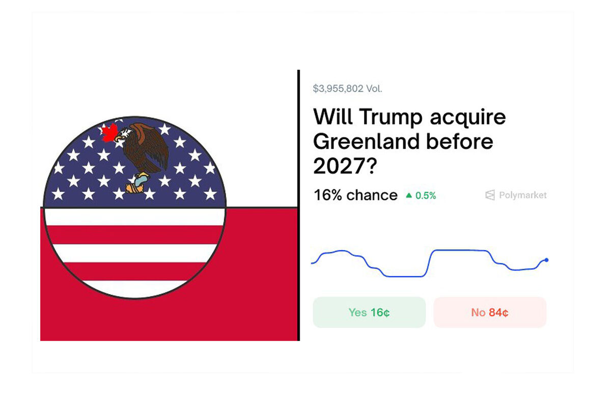 Пользователи американской онлайн-платформы прогнозов Polymarket оценивают вероятность присоединения Гренландии к США до 2027 года лишь в 16%. Об этом свидетельствуют данные сервиса.