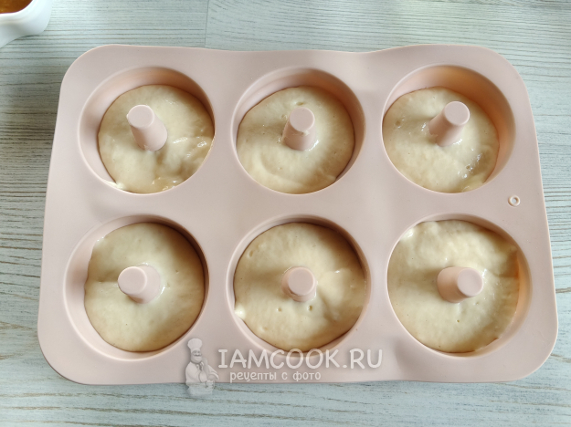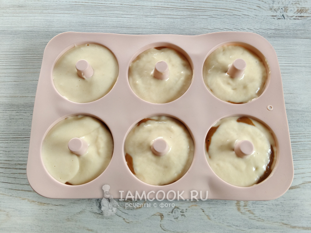 Форму для пончиков наполнить тестом, буквально только низ. Удобно это делать кондитерским мешком, я даже многовато налила, можно и меньше.