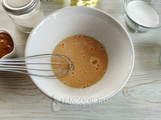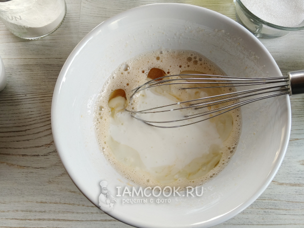 Яйцо перемешать с сахаром и солью, чтобы сахар растворился.