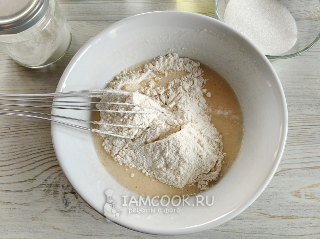 Перемешать, насыпать муку и разрыхлитель.