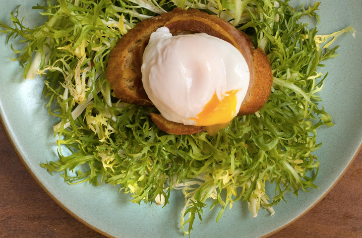 Фризе выложить в миску. Сверху полить смесью масла и жира, посолить и поперчить. В сковороду налить хересный уксус, уварить примерно вдвое. Снять с огня. Яйца достать из миски, насухо промокнуть. Фризе разделить на четыре тарелки, сверху положить гренку, ломтик панчетты и яйцо-пашот. Полить хересным уксусом, приправить солью и перцем.