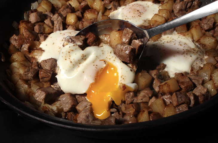 2 ст.л. растительного или оливкового масла 2 ст.л. сливочного масла 2 стейка Нью-Йорк, мясо нарезать средними кубиками 0,45 кг. красного среднего картофеля, очистить и порезать небольшими кубиками 1 ч.л. соли + для приправы Половинка среднего лука, порезать небольшими кубиками 4 больших яйца