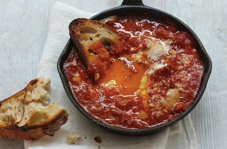 3 ст.л. несоленого сливочного масла 1 луковица, нарезать Соль грубого помола 1 зубчик чеснока, измельчить 1 банка сливовидных помидоров Свежемолотый черный перец Цепотка красного перца 4 больших яйца Свежий хлеб