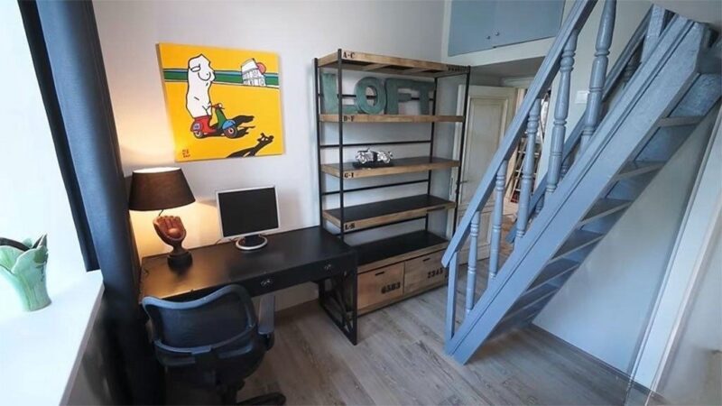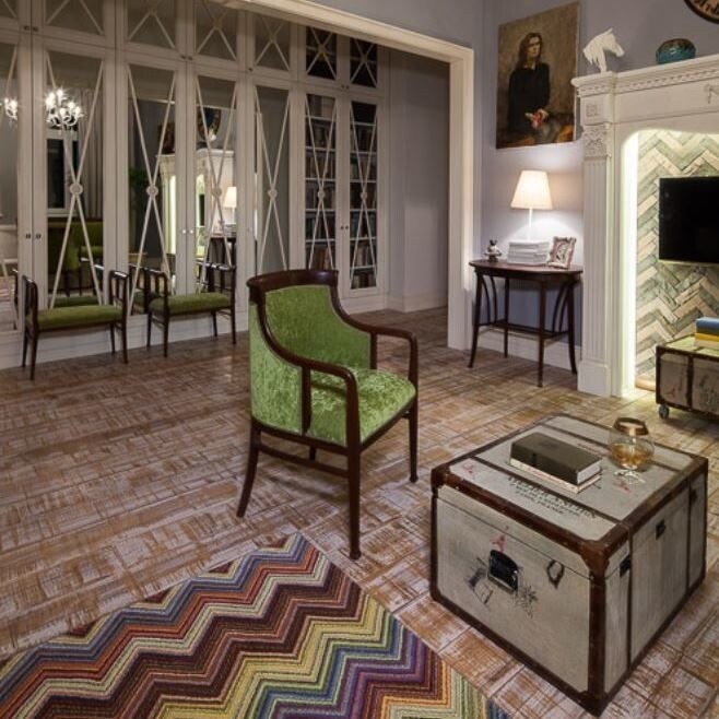 Антикварная мебель мгновенно притягивает взгляд: старинные кресла, уютный диван, изящное бюро, а также необычный кофейный столик, выполненный в виде винтажных чемоданов. Все эти элементы не создают ощущения музейной экспозиции, напротив — пространство получилось живым, дышащим и невероятно уютным, словно каждый предмет рассказывает свою историю.