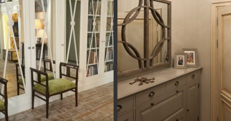 Зеркальные шкафы и хрустальная люстра, наполняющие комнату светом