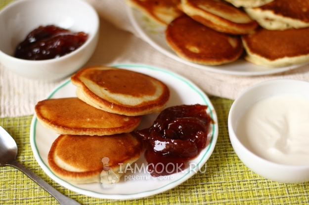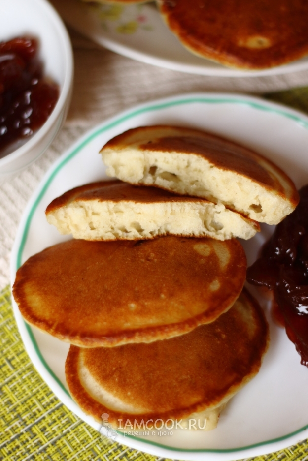 Пышные оладьи на кефире для ребёнка готовы! Подаем к столу, немного остудив, со сметаной и вареньем.