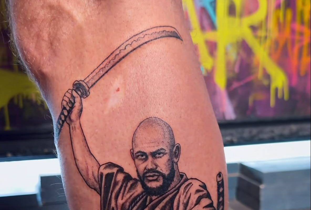 Джиган посетил мастера по тату вместе со своим сыном Давидом. Рэперу сделали на ноге татуировку — самурая, который держит в руках мечи. Рядом с исполнителем в костюме война сидел его наследник.