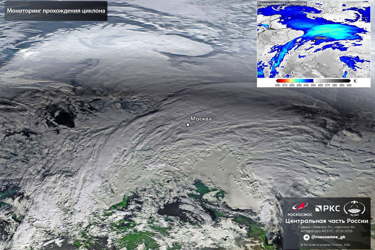 Госкорпорация "Роскосмос" в своем Telegram-канале опубликовала спутниковые снимки циклона, который принесет в Москву аномальный снегопад.