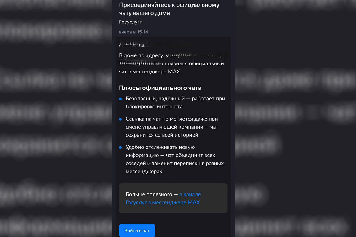 Россияне начали получать от Госуслуг уведомления о создании домовых чатов в мессенджере MAX. В этом убедился корреспондент "Газеты.Ru".