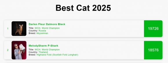 Этот рыжий красавец родился 15 июня 2024 года, а уже в 2025 собрал все лавры. Он набрал почти 20 000 баллов, обогнав вислоухого кота из Таиланда и британца из Белоруссии.