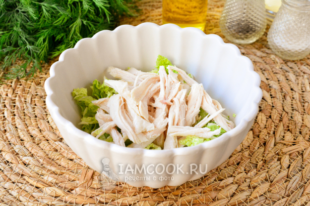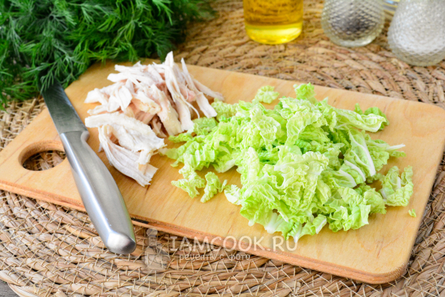 Сваренное и остывшее куриное филе разберите на волокна или нарежьте тонкой соломкой. Пекинскую капусту нашинкуйте.