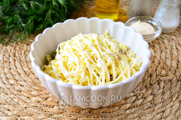 Твердый сыр и сваренные куриные яйца натрите на мелкой терке и выложите в салат.