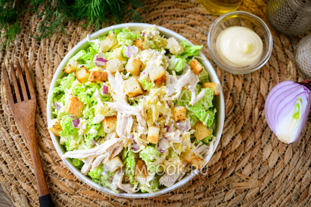 Салат с пекинской капустой, курицей и сухариками сразу подавайте к столу - это вкусно и сытно.