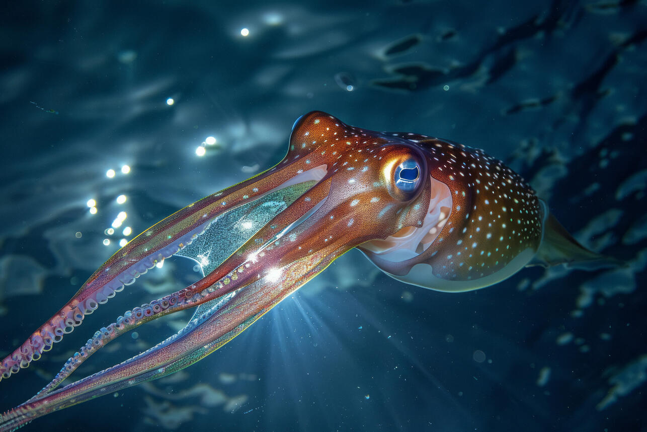Этот маленький кальмарчик – настоящий фейерверк! Все его тело покрыто крошечными светящимися точками-органами, называемыми фотофорами. Кальмар-светлячок вспыхивает ярко-голубым светом, чтобы добывать себе пропитание и сбивать с толку хищников.