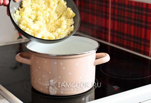 Выньте картошку из кастрюли и разомните вилкой в тарелке, а затем верните обратно.