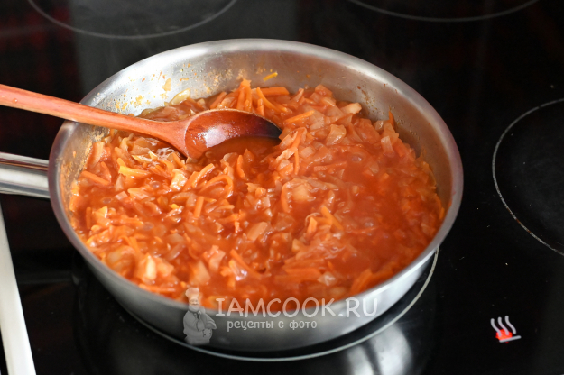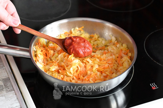 Добавьте томатную пасту и продолжайте обжарку ещё пару минут.