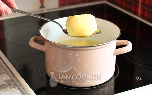 В кастрюлю налейте воду, положите в неё очищенную картошку целиком и сварите до мягкости. Картошка может немного развариться, так даже лучше. По времени варки всё зависит от картофеля и его размеров, но в среднем минут 30-35 варится целый картофель.