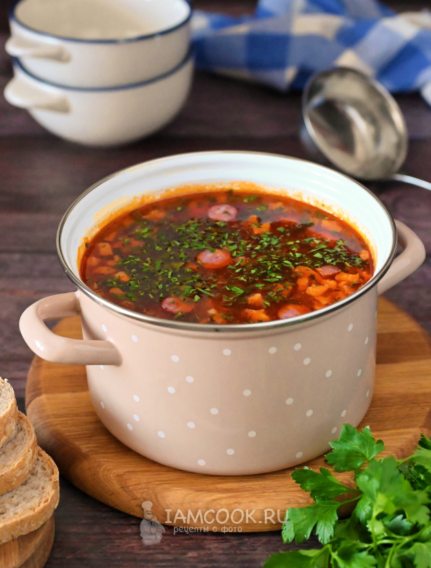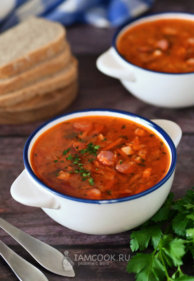 Щи из квашеной капусты с копчёностями готовы, пора обедать!