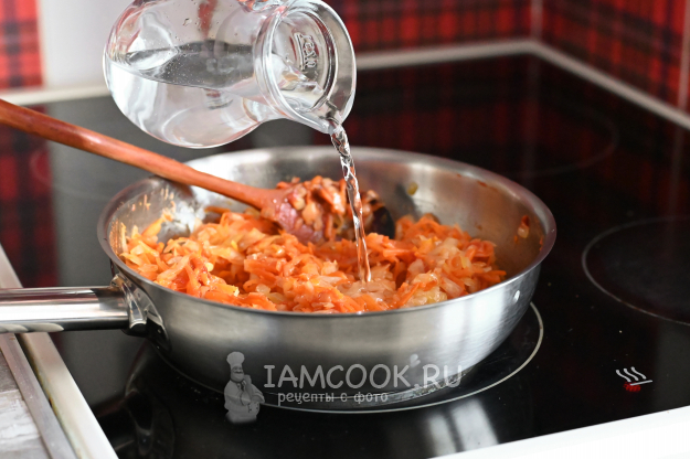 Затем влейте примерно стакан воды (она должна едва-едва покрыть капусту).