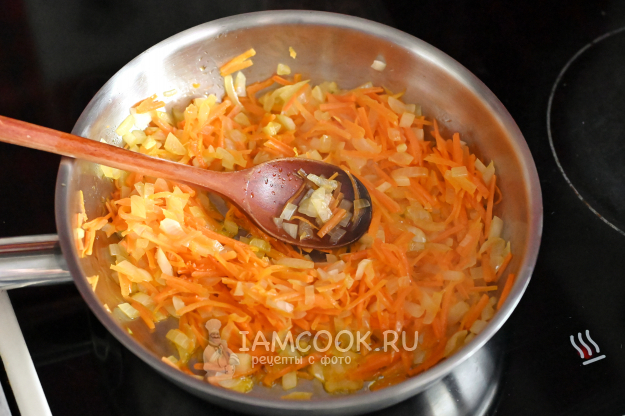 Разогрейте в сковороде растительное масло и обжарьте до прозрачности лук с морковкой. Вместо растительного масла, кстати, можно использовать смалец, будет ещё вкуснее.