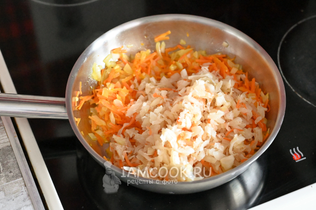Квашеную капусту отожмите от рассола и нарежьте помельче. Отправьте сюда же, в сковородку. Обжарьте вместе с луком и морковью ещё 5-7 минут, огонь можно прибавить.