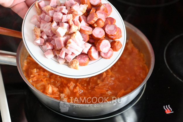 Сюда же добавьте тушёную квашеную капусту с копчёностями.