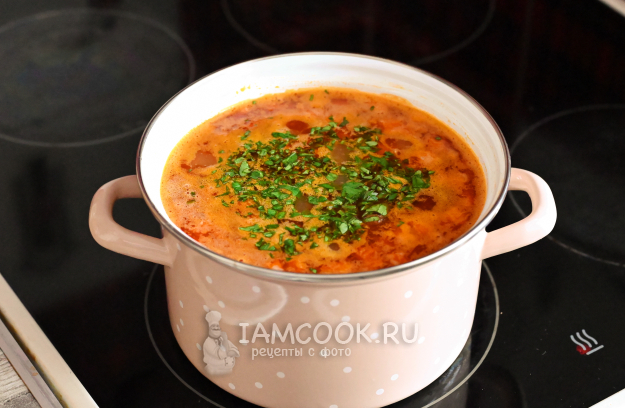 Доведите щи до кипения и добавьте нарубленную зелень. Плиту выключите, а кастрюлю оставьте на горячей конфорке ещё на 30 минут (накройте крышкой). Так щи настоятся и будут ещё вкуснее.