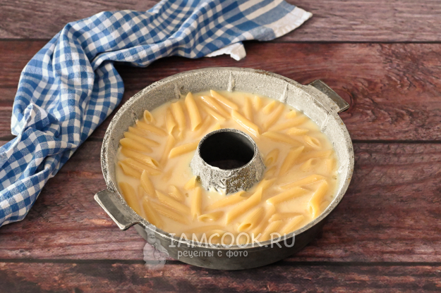 Выложите макароны, перемешанные с яйцами, в форму и равномерно распределите.