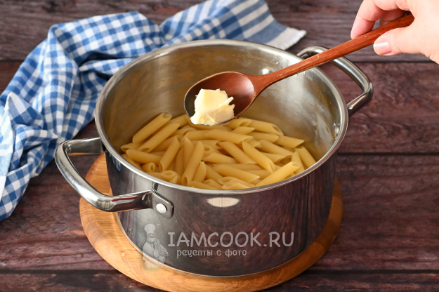 С макарон слейте воду, добавьте к ним кусочек сливочного масла и перемешайте. Пока отставьте в сторонку, чтобы макароны чуть остыли. Полностью можно не остужать.