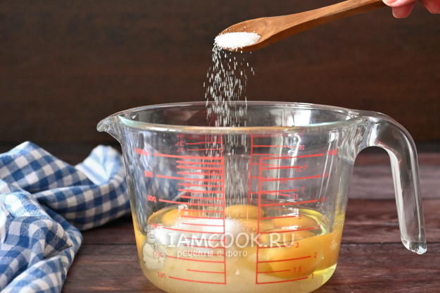 Добавьте к ним соль и сахар. И слегка перемешайте венчиком.